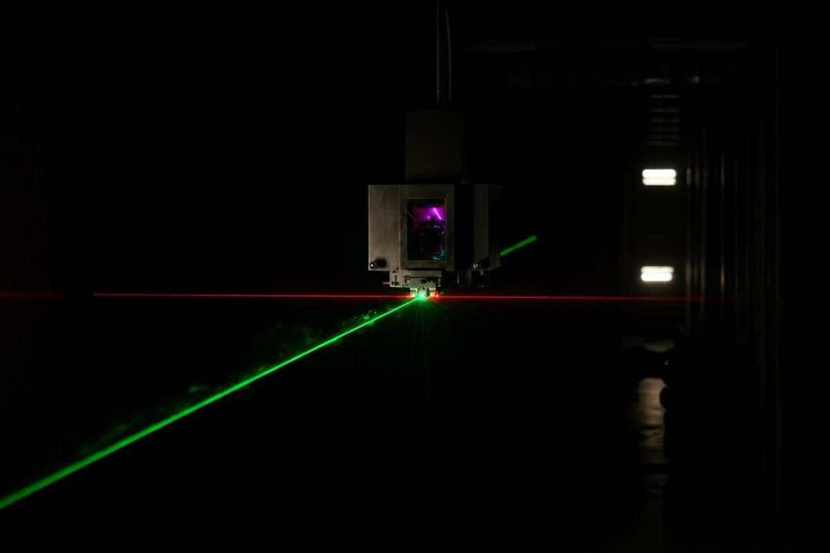 Una volta montato ed assemblato il tutto, fissatelo ad un supporto stabile orientato verso un corpo nero non infiammabile (AVETE LETTO LE REGOLE DI SICUREZZA; VERO?), indossate gli occhiali di protezione ed accendete! In questa foto potete vedere il laser, assemblato e montato su una aletta di raffreddamento di cirda 4×4 centimetri, che proietta il suo fascio verso quell’oggetto rotondo che altro non è che un misuratore di potenza professionale. Risultato: 108 milliWatt!! (Quello sullo sfondo è il fascio blu di un laser ad Argon, ma è tutta un’altra storia)